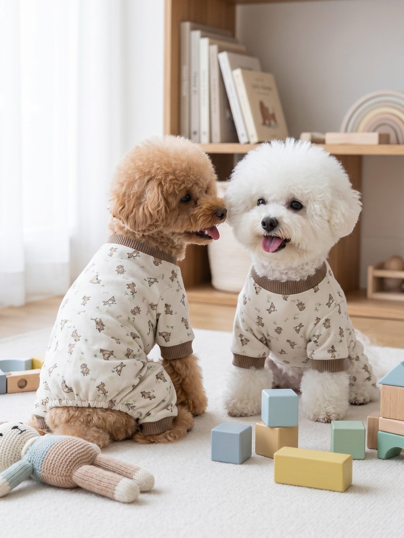 breeds and friends köpek tulumu, çok ırklı desenli köpek pijaması, penye köpek kıyafeti, köpek uyku tulumu, pamuklu köpek pijaması, küçük ırk köpek kıyafeti, köpek ev kıyafeti, tüy dökülmesini azaltan köpek tulumu, dog pajama set, desenli köpek tulumu