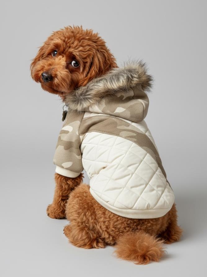 Kemique Kamuflaj Peluş Kapüşonlu Köpek Ceketi Krem Bej