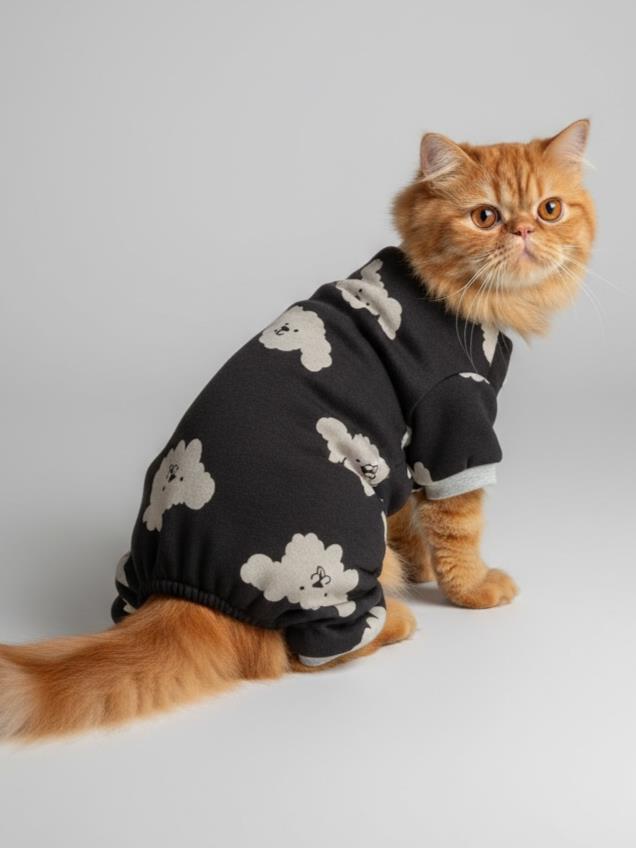 Kemique Doggy Doo Kedi Tulumu, yumuşacık penye kumaşı ve sevimli gri aslan desenleriyle hem zarif hem konforlu bir tasarıma sahiptir.