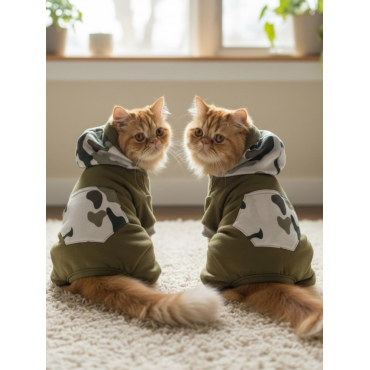Kamuflaj Desenli Kedi Tulumu | Kapüşonlu | Pamuklu Polar Kumaş | Haki Yeşil | Küçük Irklar İçin