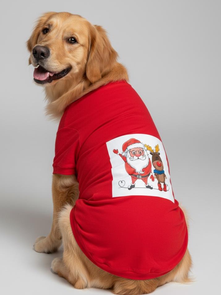 Kırmızı Noel Baba ve Geyik Baskılı Yılbaşı Köpek Tişörtü, pamuklu ve esnek kumaşıyla köpeğinizin gün boyu rahat etmesini sağlar. Hafif yapısıyla ev içinde, yürüyüşlerde ve yılbaşı fotoğraflarında ideal bir kullanım sunar. Dayanıklı baskısı sayesinde renkler uzun süre canlı kalır.
