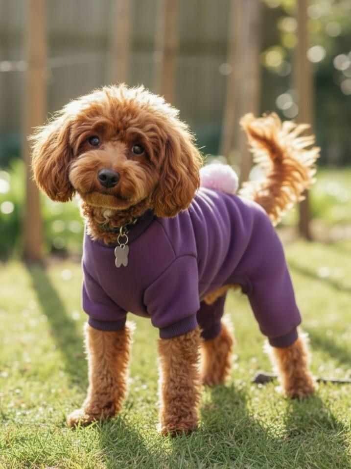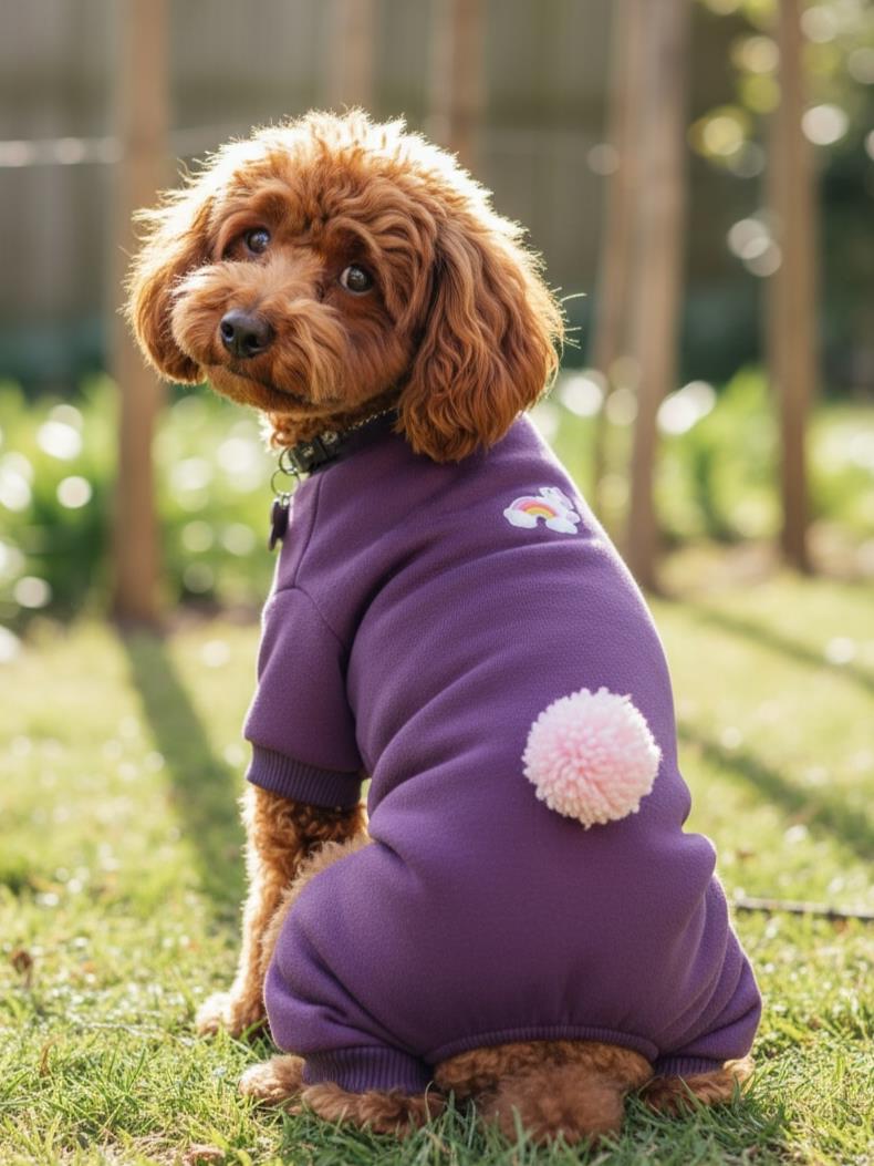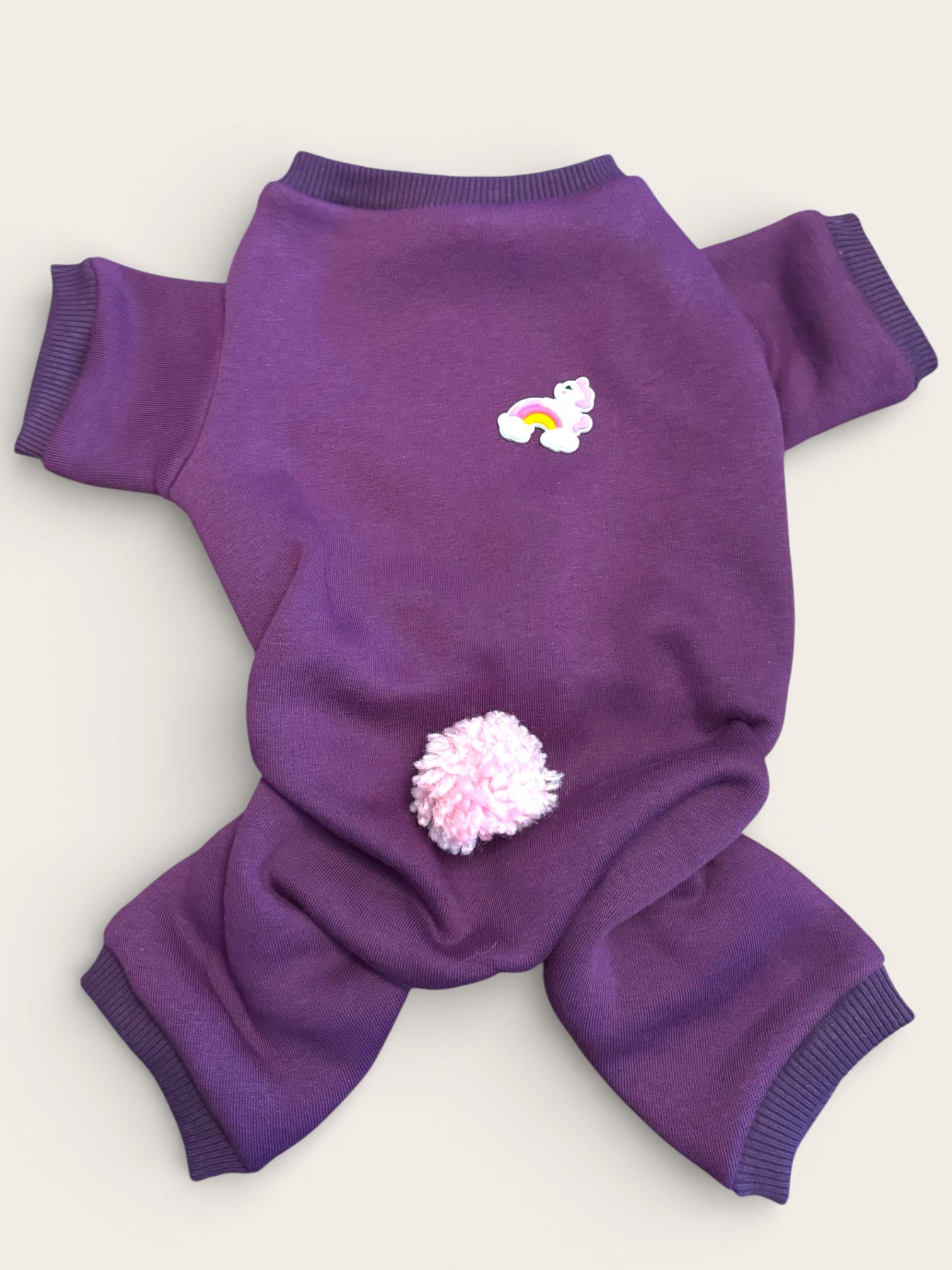 köpek tulumu, ponponlu köpek tulumu, mor köpek tulumu, polar köpek tulumu, şardonlu köpek tulumu, küçük ırk köpek kıyafeti, köpek pijaması, tüy dökülmesini azaltan köpek tulumu, ev içi köpek tulumu, dog jumpsuit, cute dog outfit, pet fashion