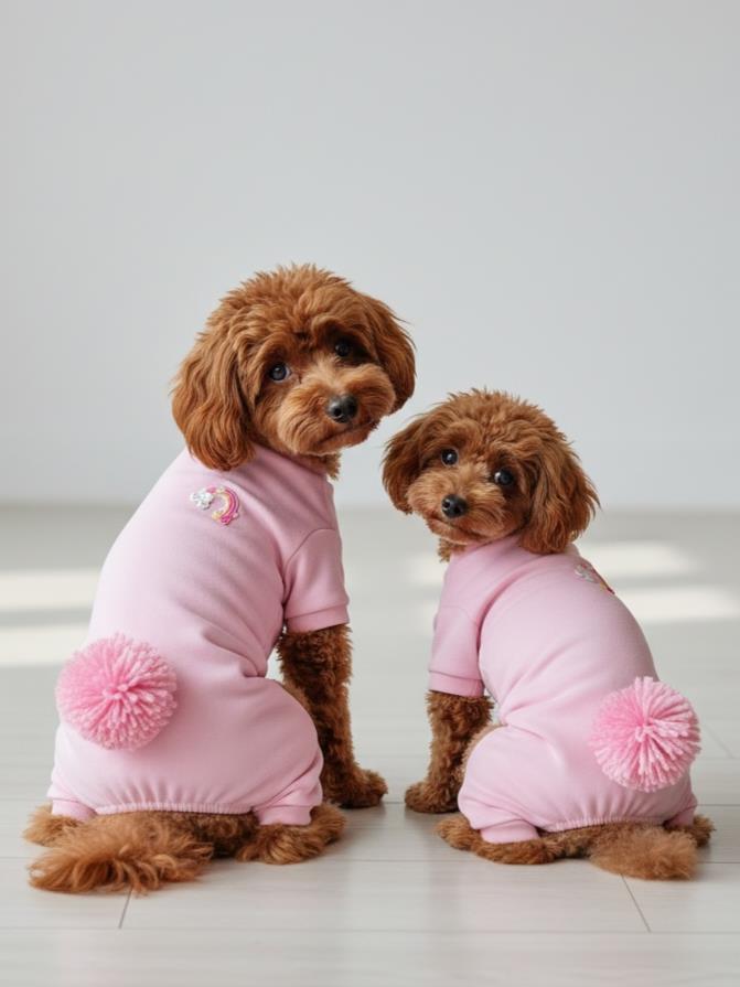 Tassel and Rainbow Pink Tulum, köpekler için özel olarak tasarlanmış sevimli ve stil sahibi bir ev tulumudur. Yumuşak pembe tonu, sırt kısmındaki zarif gökkuşağı detayı ve arka bölümdeki ponpon püskül tasarımı ile hem eğlenceli hem de şık bir görünüm sunar.