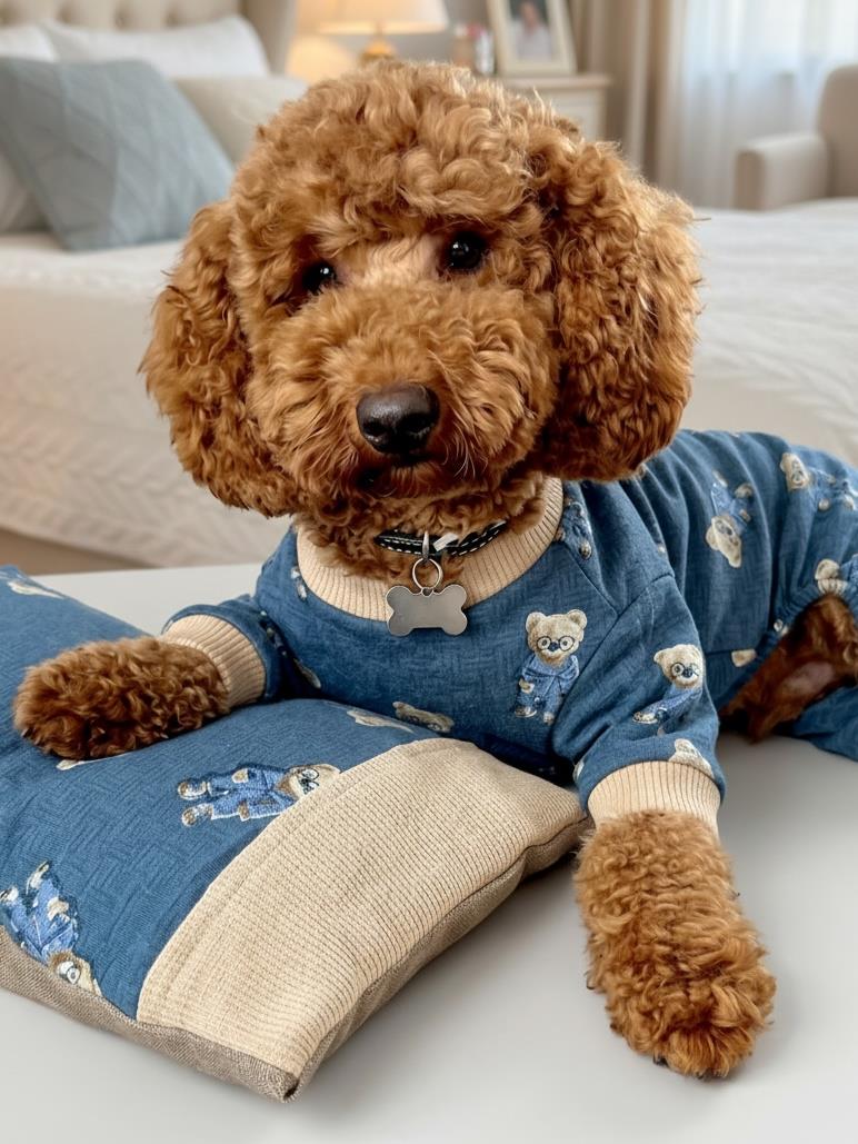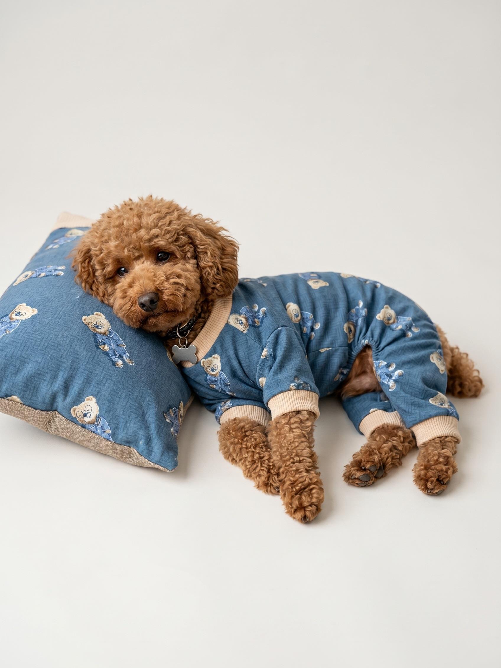 Teddy Blues Uyku Takımı | Ayıcık Desenli Pamuklu Penye Köpek Tulumu ve Mini Yastık | Küçük Irklar İçin | Tüy Dökülmesini Azaltır